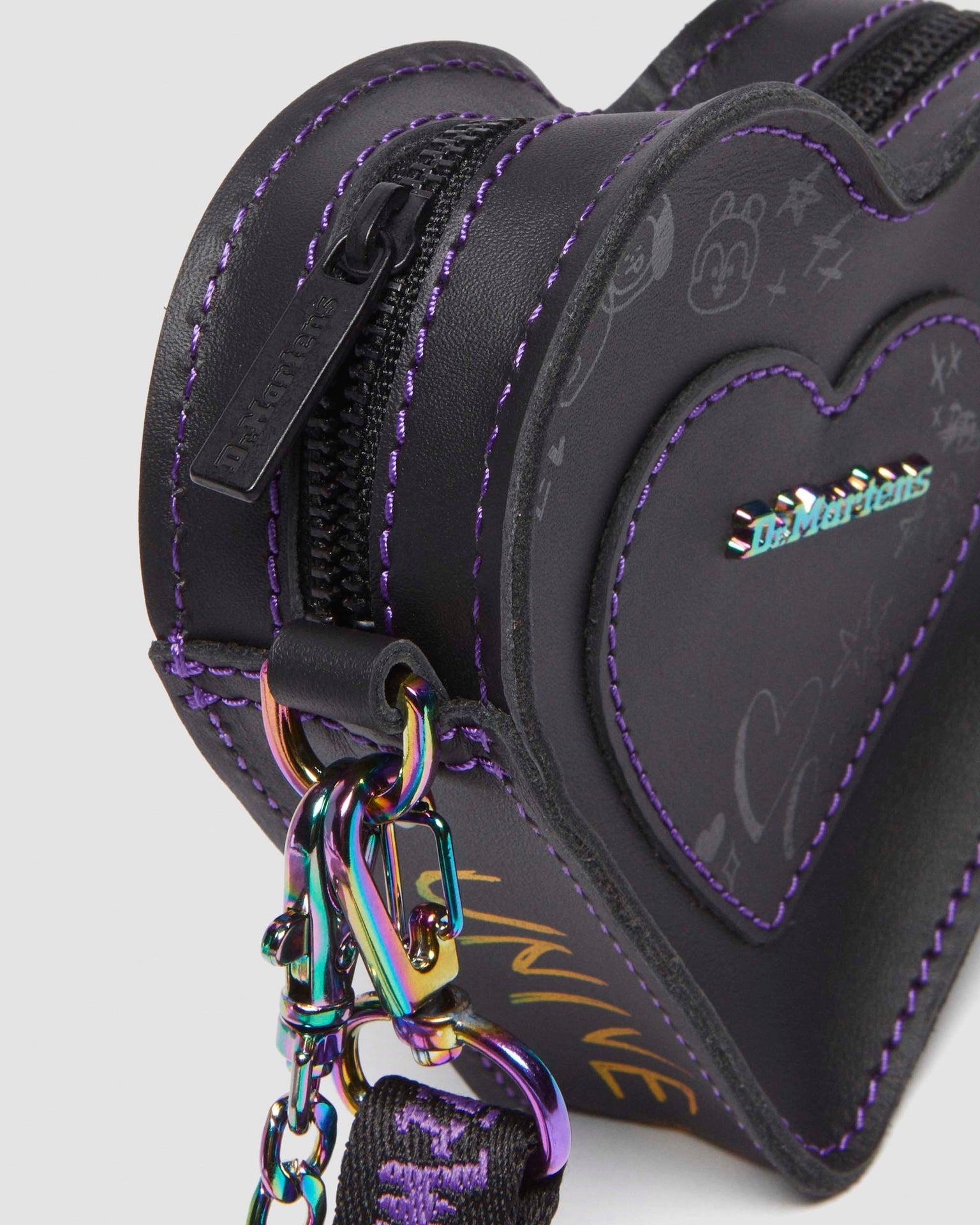 Express yourself in our latest collaboration with the BT21 Universe. Adorning our Mini Heart bag with playful characters and illustrations across the soft, Nappa leather. Highlighted with a purple upper stitching, iridescent hardware and illustrated heart charm. Each bag is equipped with a black and purple webbed strap and an iridescent chain strap.