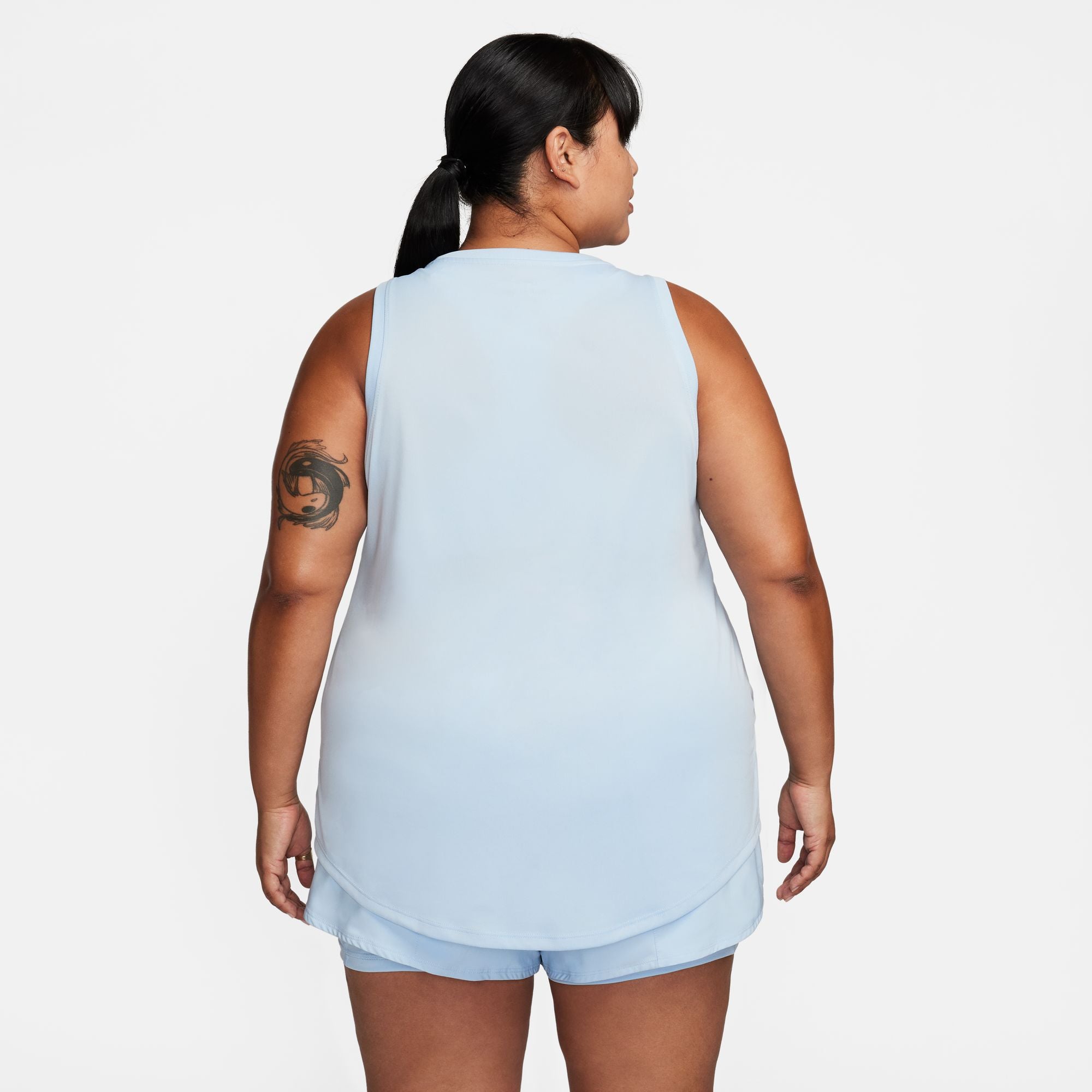 Curved hem keeps you covered as you bend and stretch.