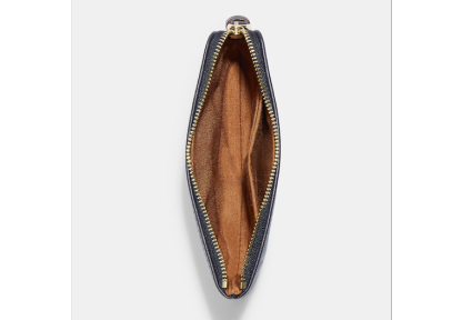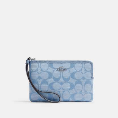 Signature chambray and smooth leather Two credit card slots Zip-top closure fabric lining Wrist strap attached 6 1/4 (L) x 4 (H) x 1/2 (W) Style No. CH371 | Outlet Corner Zip Wristlet In Signature Chambray - Blue