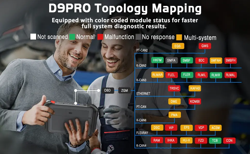 • OE-Level Full System Diagnostic with Topplogy Module Mapping: With Topplogy Map for faster full system diagnostic to view the communication structure between modules clearly with all the situation of each system tp read/clear codes, live data PIDs graphing for all vehicle systems including Engine, Transmission, Chassis and Safety control system, Body control system, Communication and Entertainment system, etc.